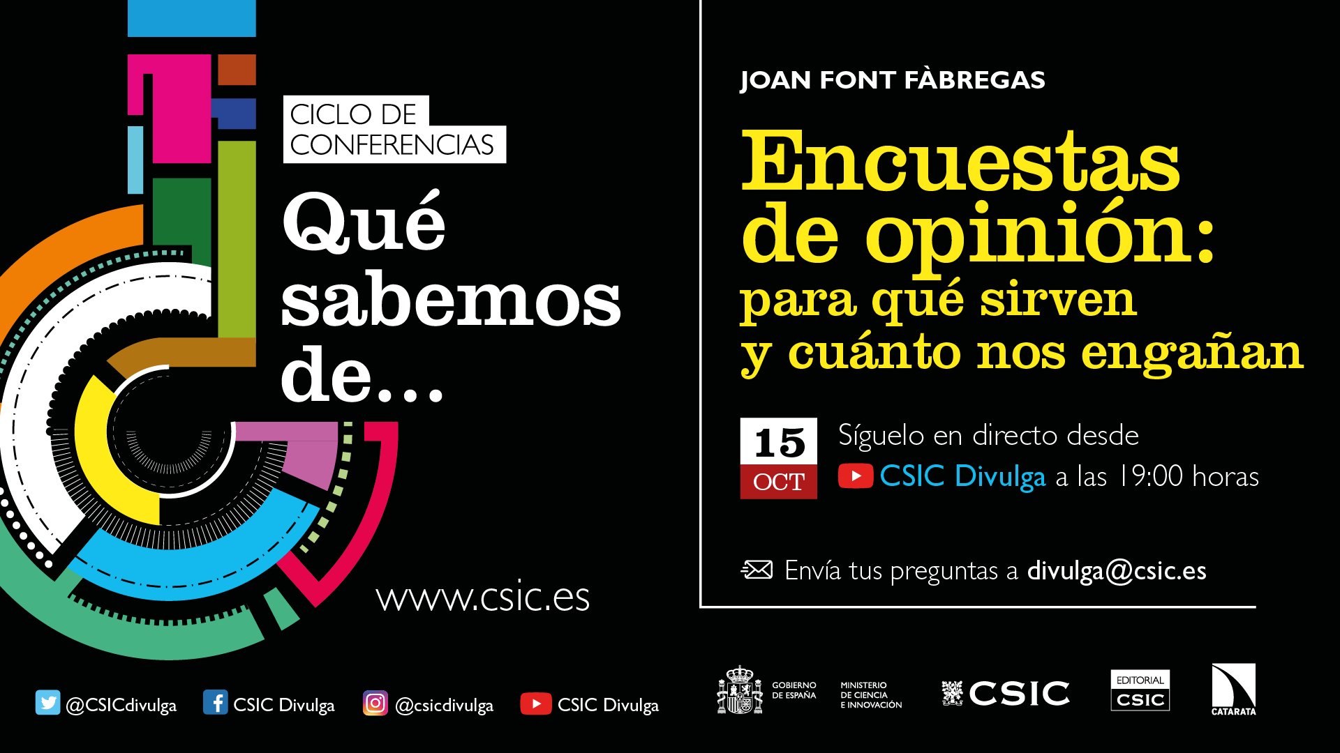 Las encuestas forman parte de nuestra cotidianeidad: casi todos los días escuchamos algo sobre ellas en los medios de comunicación y son utilizadas por ministerios o parlamentos en la toma de decisiones. Pero, ¿son mejores o peores que otras herramientas que utilizan las administraciones públicas para escuchar a la ciudadanía? Esta pregunta es una de las que guían la charla Encuestas de opinión: para qué sirven y cuánto nos engañan, que el especialista en ciencias sociales Joan Font ofrecerá online el jueves 15 de octubre, a las 19:00 horas, en el canal de Youtube CSIC Divulga.