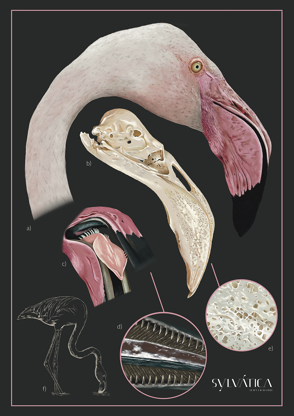 Los flamencos comunes (Phoenicopterus roseus) filtran el agua para obtener las algas, el plancton y los moluscos de los que se alimentan. Cuando quieren comer, sumergen su cabeza y se desplazan o la mueven de un lado a otro (f). El agua entonces atraviesa su robusto y curvado pico, que posee una serie de laminillas filtradoras y, a continuación, se encuentra con una carnosa lengua provista de pilosidades que facilitan la ingesta de alimento (c). La infografía representa también la cabeza de estos animales (a), el cráneo (b) y la parte superior (d) y las terminaciones nerviosas de su pico (e).
