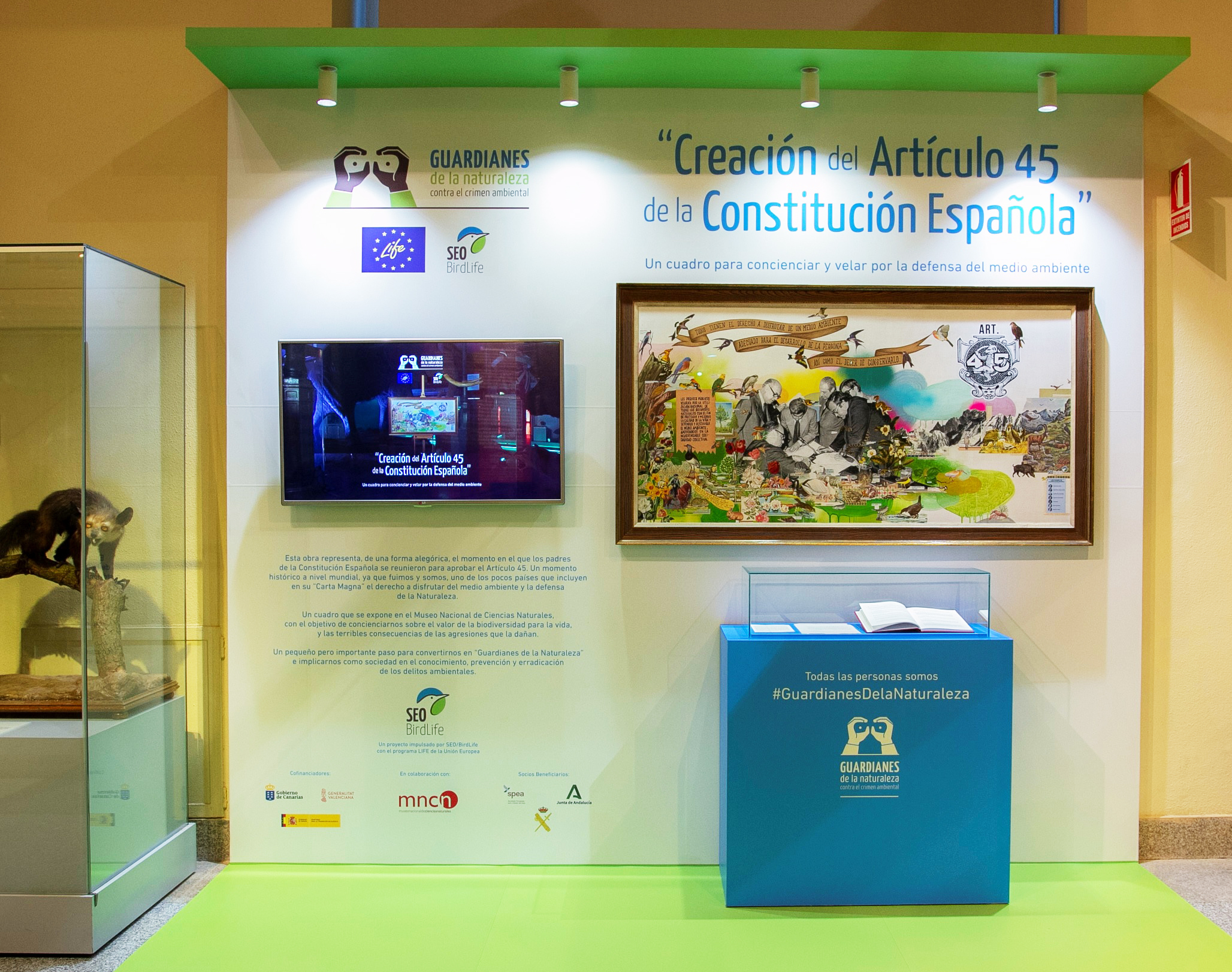El cuadro Creación del artículo 45 de la Constitución Española ha sido realizado por el artista Julio Falagán en el marco del proyecto Life Guardianes de la Naturaleza, cuyo objetivo es que la ciudadanía conozca, identifique y prevenga las agresiones ambientales. “En estos momentos en los que nos enfrentamos a desafíos que comprometen a las generaciones futuras hay que situar el derecho al medio ambiente en el lugar central que siempre ha debido ocupar, como derecho humano universal”, ha afirmado durante la presentación Asunción Ruiz, directora ejecutiva de SEO/BirdLife.