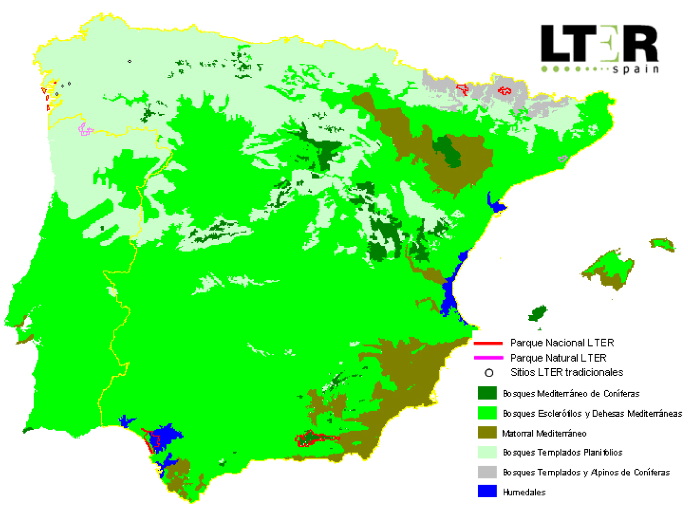 La red LTER-España, creada en 2008, se compone de 11 sitios con sus respectivos centros de investigación vinculados: cinco de ellos son Parques Nacionales [Doñana (EBD-CSIC), Sierra Nevada (UGR-CEAMA), Aigüestortes (CEAB-CSIC), Ordesa y Monte Perdido incorporado en 2010 (IPE-CSIC) e Islas Atlánticas], donde existen programas de seguimiento e investigación ecológica establecidos. Además, lo conforman el Parque Natural de Collserola (CREAF), el Parque Natural Baixa Limia-Xurés y cuatro sitios adicionales que conforman la Red de Observatorios Ambientales de Galicia (ROAGA).