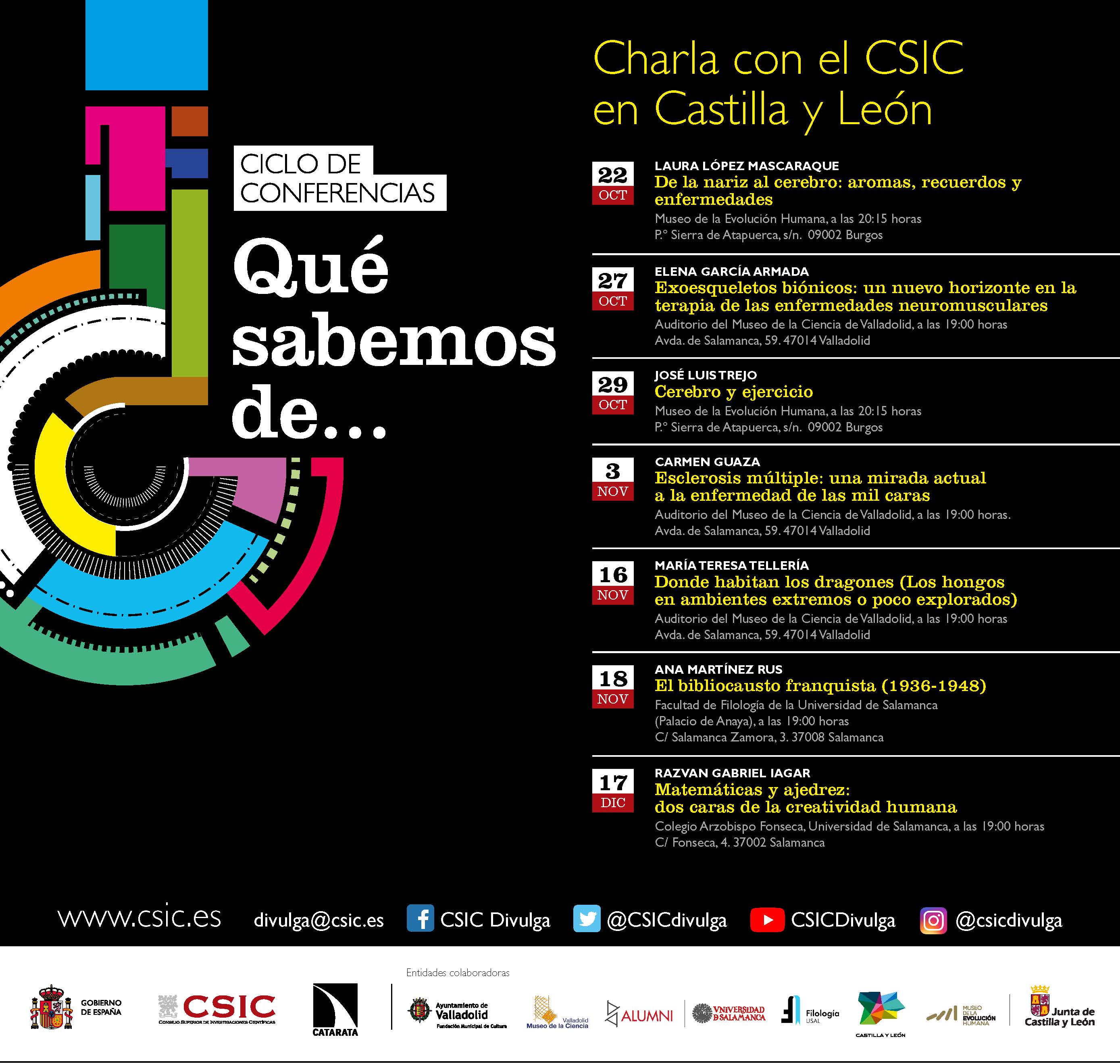 El 27 de octubre, la ingeniera industrial del Centro de Automática y Robótica (CSIC-UPM) Elena García Armada estrenará el ciclo en su ciudad de origen, Valladolid. Allí ofrecerá la charla Exoesqueletos biónicos: nuevos horizontes en la terapia de las enfermedades neuromusculares. Le seguirá María Teresa Tellería, el 16 de noviembre, con la conferencia Donde habitan los dragones (Los hongos en ambientes extremos o poco explorados). La científica del Real Jardín Botánico del CSIC se adentrará en el mundo de los hongos, uno de los grupos de organismos más abundantes y, sin embargo, menos conocidos. Por su parte, el 18 de noviembre, Carmen Guaza, investigadora del IC-CSIC, hablará sobre la enfermedad crónica, inflamatoria y neurodegenerativa del sistema nervioso central que afecta a 2,5 millones de personas en el mundo, en la Esclerosis múltiple: una mirada actual a la enfermedad de las mil caras.