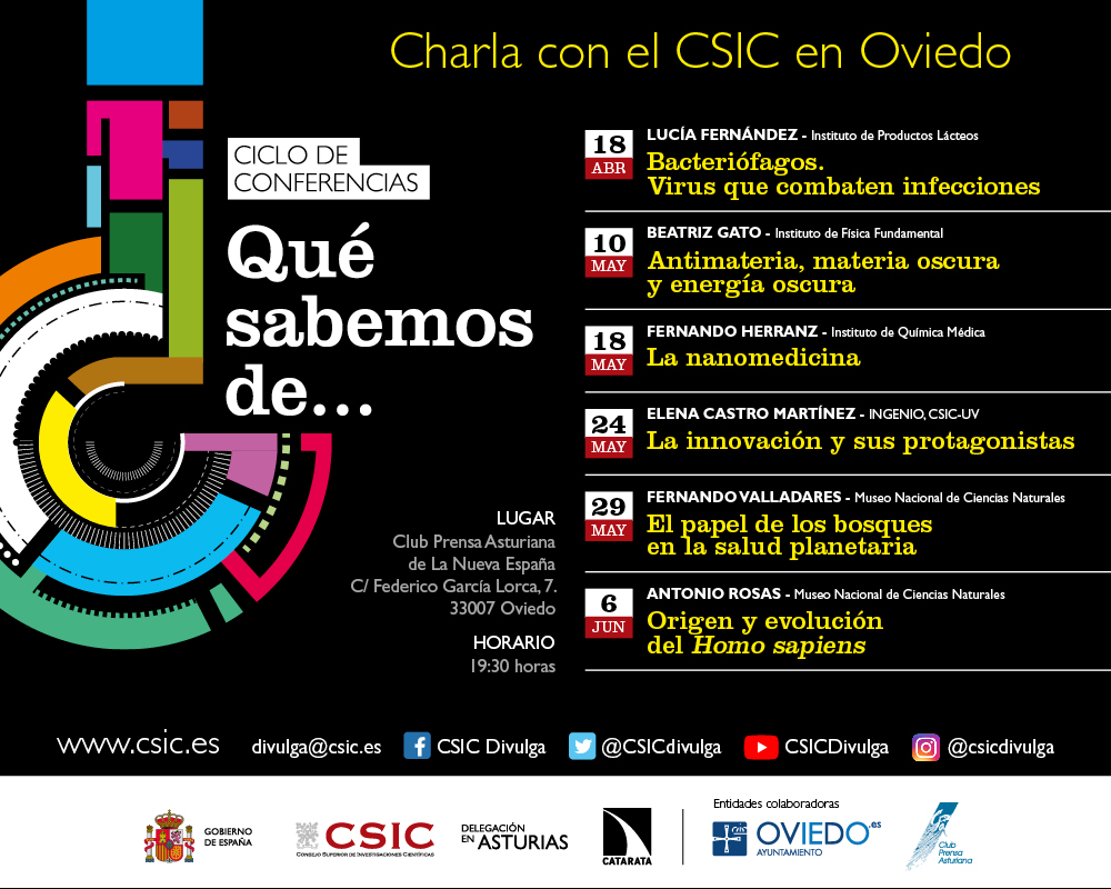 Bacteriófagos. Virus que combaten infecciones es el título de la conferencia que abre mañana un nuevo ciclo ¿Qué sabemos de? en Oviedo. La programación, organizada por la Delegación del CSIC en Asturias, incluye seis charlas que se celebrarán a las 19:30 horas en el Club de la Prensa Asturiana de La Nueva España hasta el mes de junio.