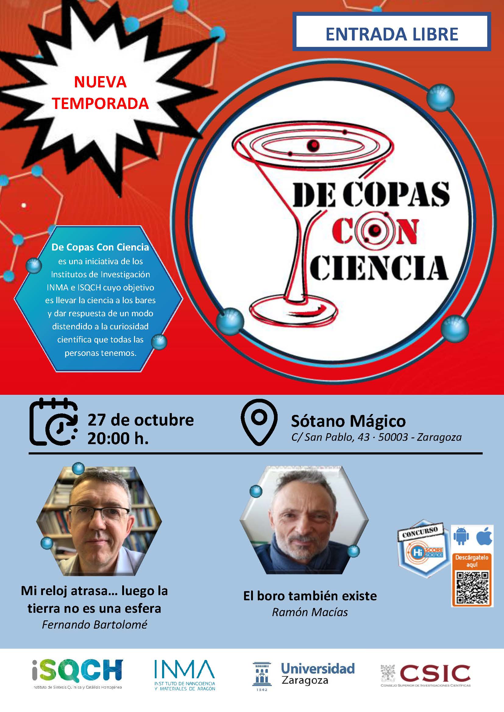 El jueves 27 de octubre dará comienzo la VI temporada de 'De copas con ciencia'. La actividad es organizada un año más por los institutos de investigación mixtos del CSIC y la Universidad de Zaragoza, el Instituto de Síntesis Química y Catálisis Homogénea (ISQCH) y el Instituto de Nanociencia y Materiales de Aragón (INMA).