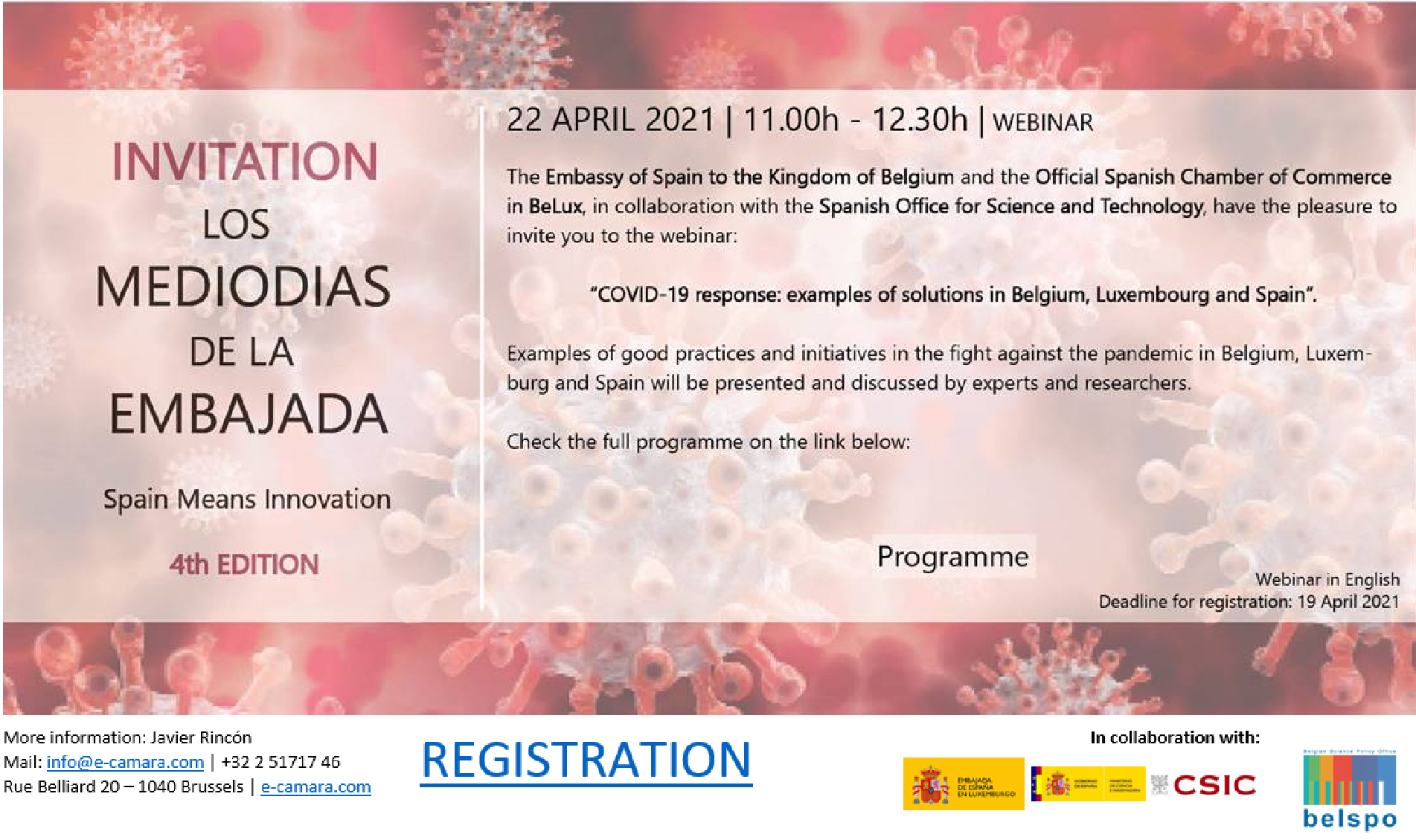 La Delegación Institucional del CSIC en Bruselas colabora en la organización de este webinar, como parte del ciclo de seminarios Spain means innovation, que realizan la Embajada de España en Bélgica, la Cámara de Comercio en Bélgica y Luxemburgo y el Centro para el Desarrollo Tecnológico Industrial (CDTI) en Bruselas. Tres especialistas del CSIC participan como ponentes.