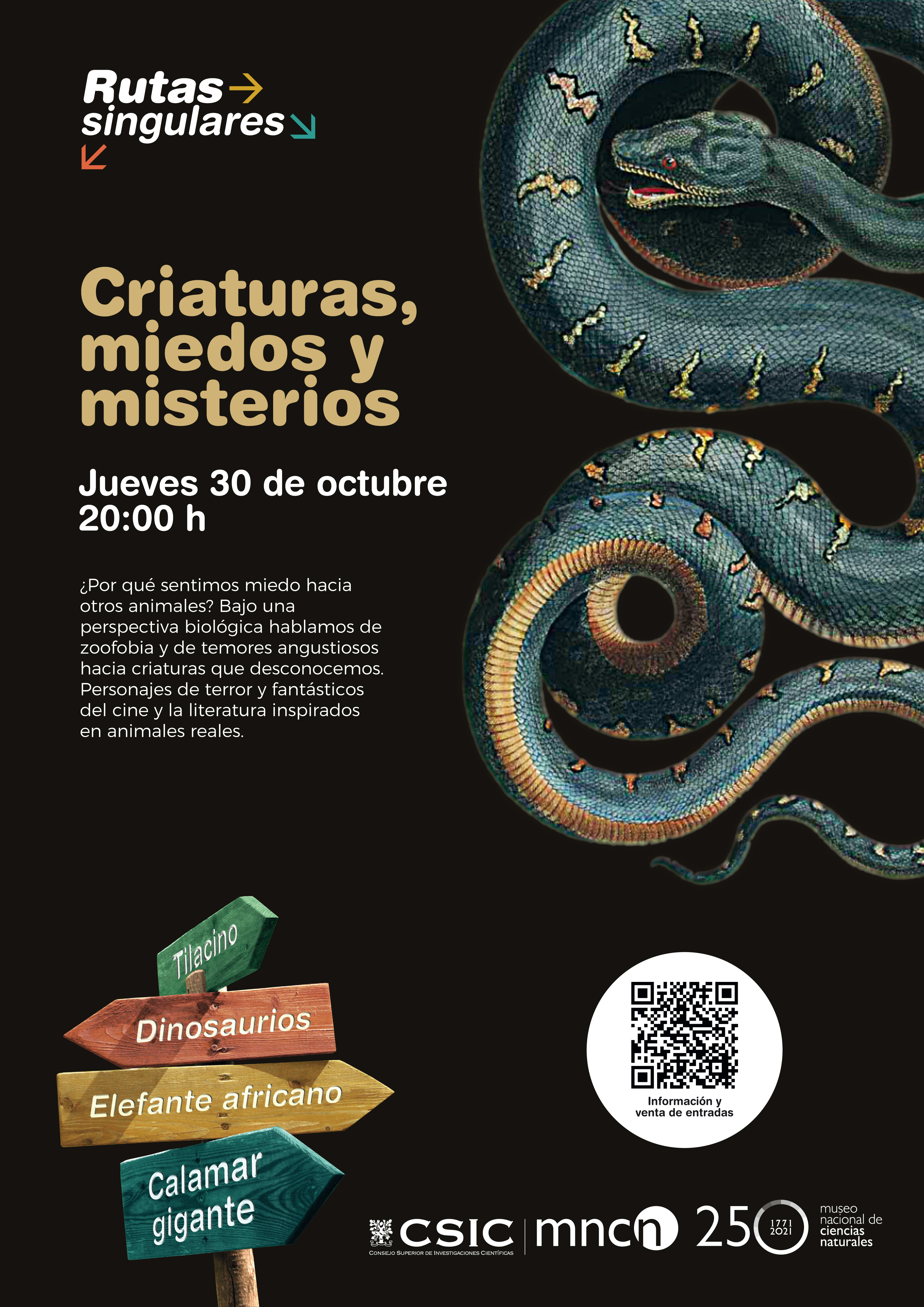En este recorrido, haremos referencia a determinados personajes de terror y fantásticos, tanto del cine como de la literatura, basados o inspirados en animales reales, muchos de ellos visibles entre los ejemplares de las exposiciones del MNCN y que serán los puntos clave del recorrido. Además, desvelaremos historias dignas de una buena saga de 'misterios en el museo'.