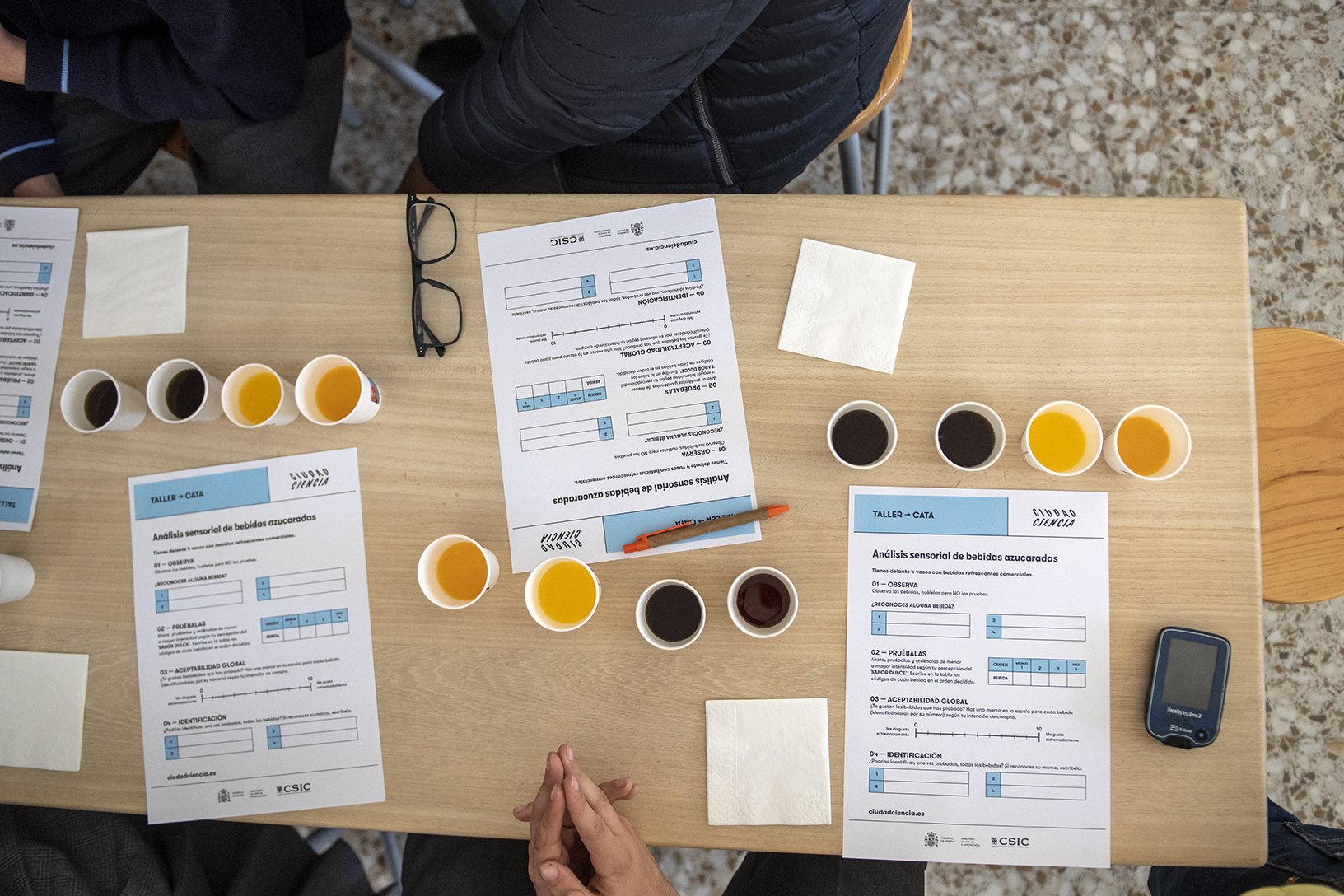 Las investigadoras Beatriz Díaz Rica y María Estela de Vega Matallanos, del Instituto de Ciencia y Tecnología de los Alimentos y Nutrición (ICTAN) del CSIC, imparten este taller-cata. El objetivo de esta actividad es que los y las participantes sean conscientes de la cantidad de azúcares libres que se consumen con las bebidas edulcoradas, azucaradas y energéticas de consumo habitual.
