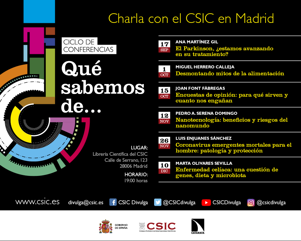 El ciclo de conferencias ¿Qué sabemos de...? pretende construir otro año más un entorno de diálogo entre la comunidad científica y la sociedad, un espacio en el que los protagonistas de la ciencia explicarán la actualidad científica, sus procesos y su impacto en nuestra vida cotidiana, dejando también tiempo para el debate. Estas charlas surgen en el marco de las colecciones de libros ¿Qué sabemos de? y Divulgación, todos escritos por investigadores e investigadoras del CSIC. Ambas colecciones son fruto de la colaboración entre el CSIC y la Editorial Catarata, y recogen en sus más de 127 títulos todo tipo de cuestiones científicas de interés público.