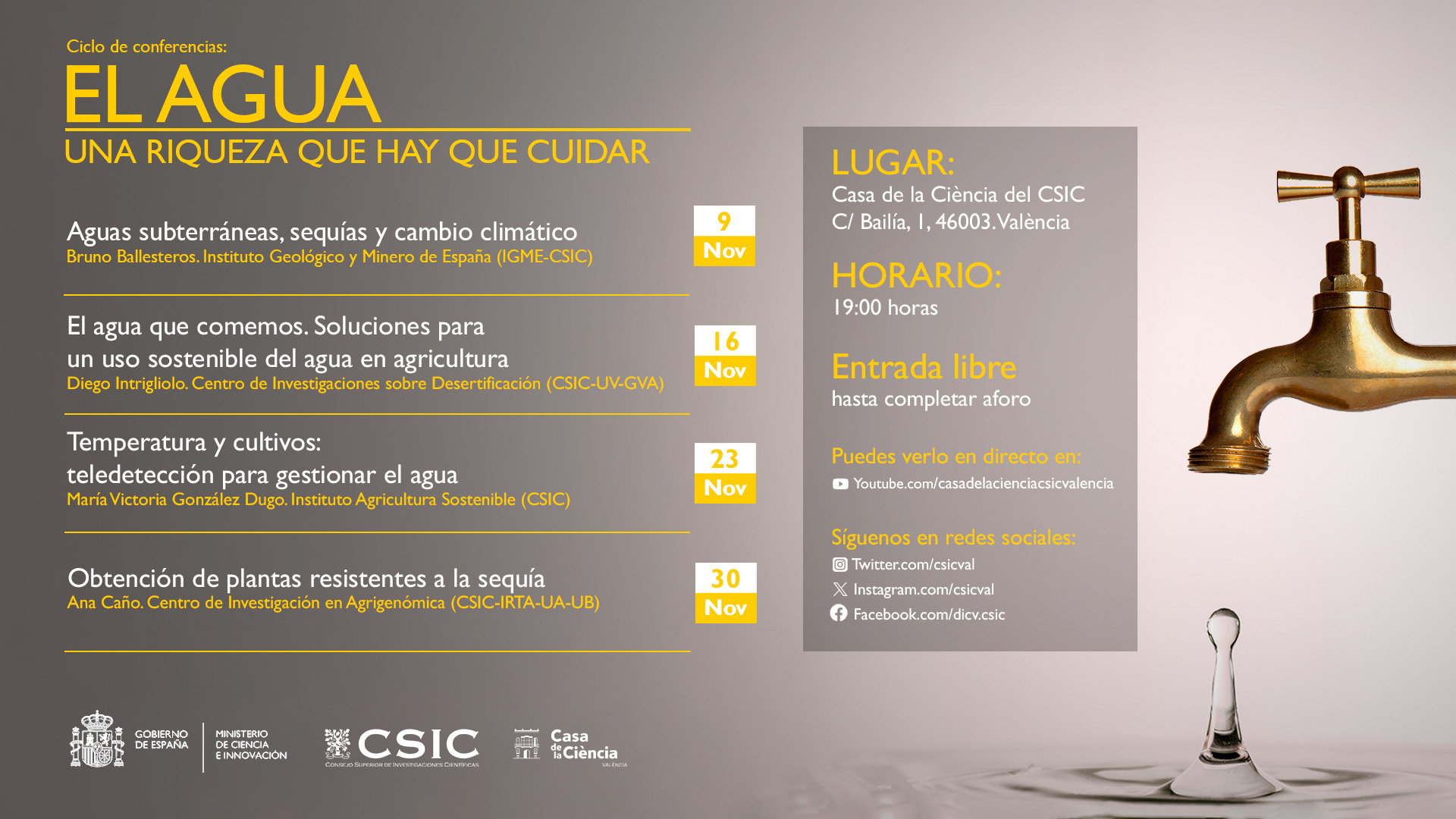 En este ciclo nos planteamos un acercamiento a la cuestión del agua de la mano de expertos. Bruno Ballesteros, investigador en el Instituto Geológico Minero (IGME-CSIC), nos hablará de las aguas subterráneas y de su potencial, no exento de riesgos, para su utilización, mientras que Diego Intrigliolo, investigador del Centro de Investigaciones sobre Desertificación (CIDE CSIC-UV-GV), planteará qué podemos hacer para conseguir un uso sostenible del agua para uso agrícola en lo ambiental, lo social y lo económico. María Victoria González Dugo, del Instituto de Agricultura Sostenible (IAS CSIC), presentará el uso de tecnologías como la teledetección para descubrir el estado hídrico de las cosechas y contribuir a la agricultura de precisión; y Ana Caño, del Centro de Regulación en Agrigenómica (CSIC-IRTA-UB-UAB), nos expondrá los avances de la genómica para contribuir a la obtención de plantas de cosecha productivas con capacidades aumentadas resistentes a la sequía.