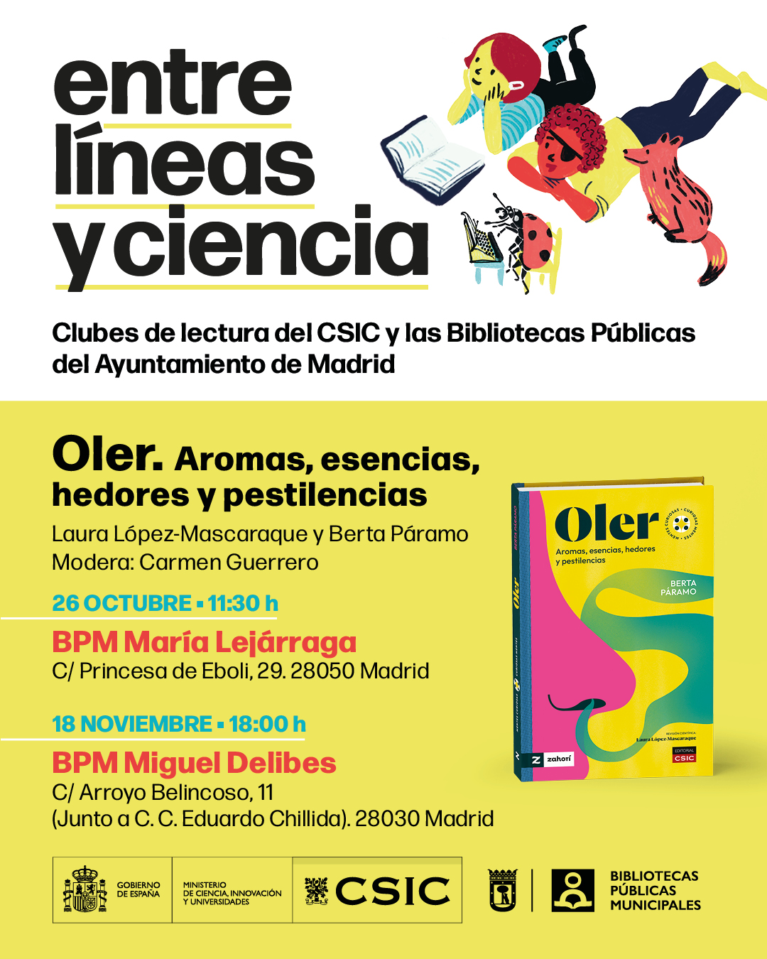 Los libros de la colección de álbum ilustrado ‘Mentes curiosas. Curiosas mentes’ (CSIC-Zahorí) serán el eje de estas cuatro sesiones pensadas para mayores y pequeños. Ilustración, ciencia y humor se unen en estos encuentros a medio camino entre club de lectura y taller donde el personal investigador del CSIC explicará el funcionamiento del sentido del olfato y presentará la asombrosa biodiversidad que existe en nuestras viviendas. Se celebrarán en: