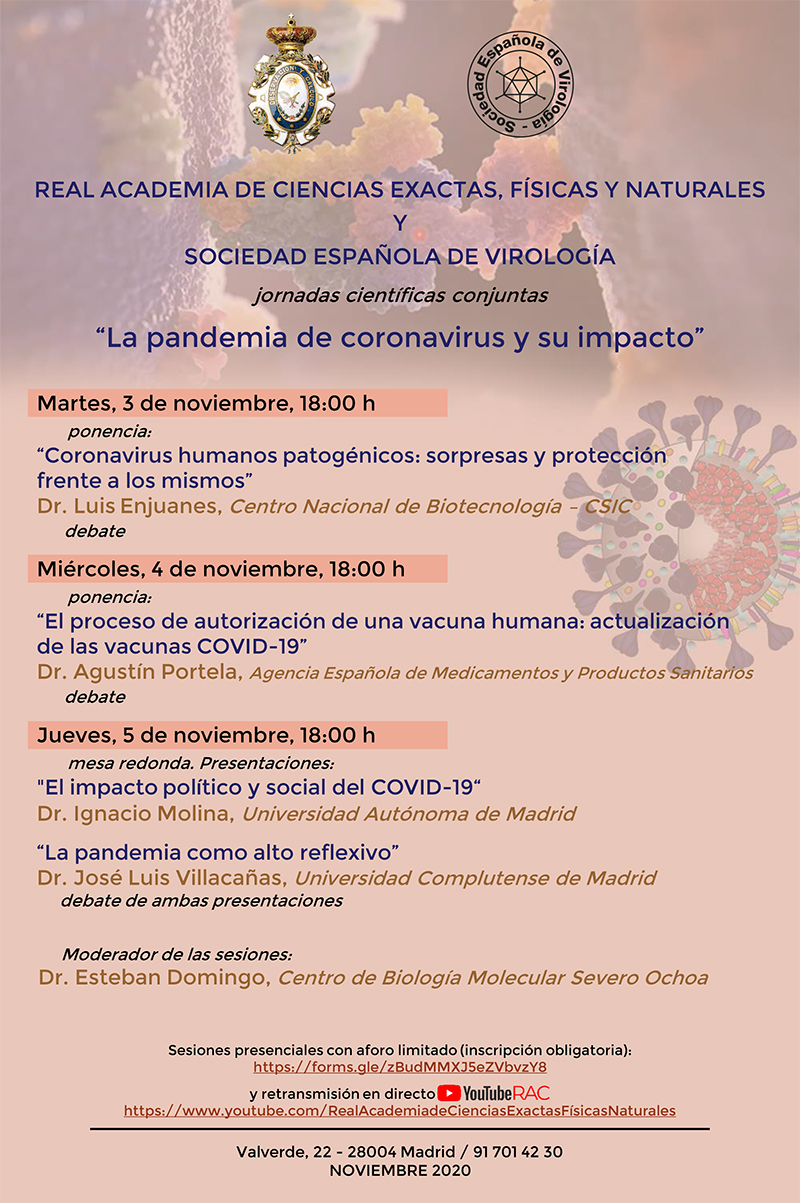 La Real Academia de Ciencias Exactas, Físicas y Naturales y la Sociedad Española de Virología organizan estas jornadas científicas conjuntas, que serán retransmitidas en directo.