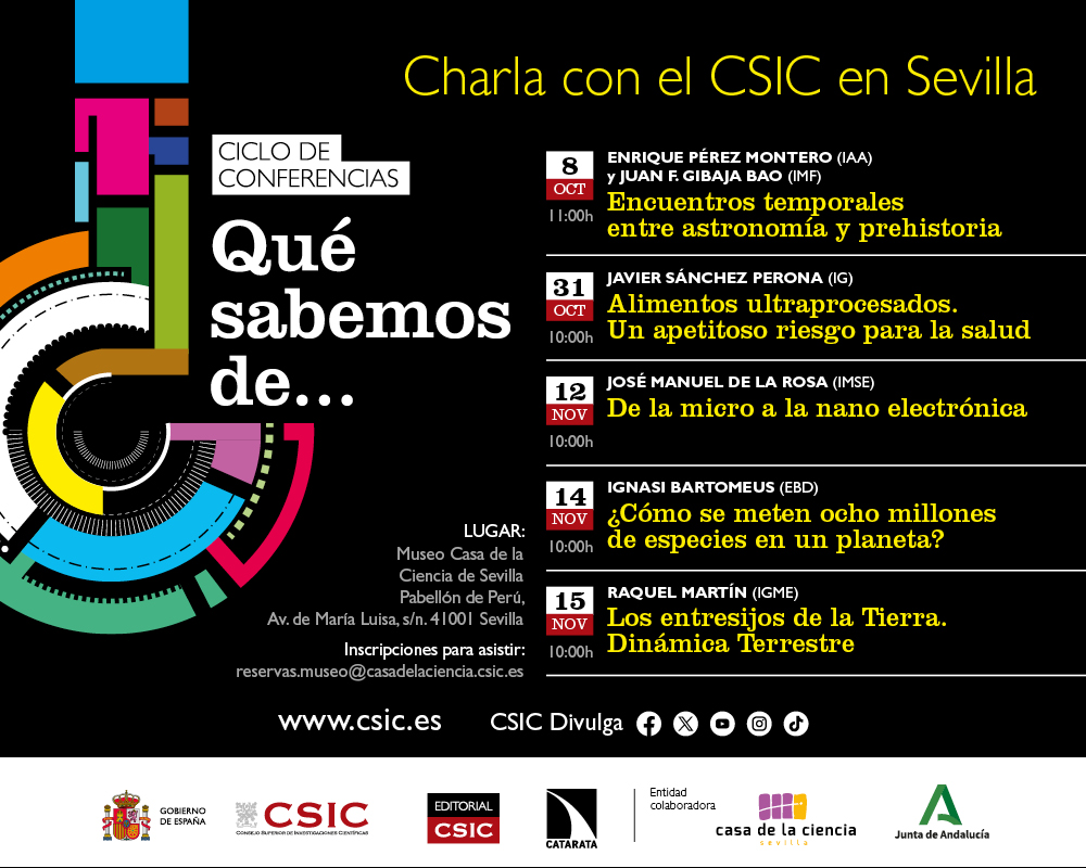 Esta conferencia cierra la última edición del ciclo de conferencias ¿Qué sabemos de...? en el Museo de la Casa de la Ciencia del CSIC en Sevilla. Las charlas se celebran en horario de mañana y pueden seguirse de manera online a través del canal de YouTube de la Delegación del CSIC en Andalucía y Extremadura. Para asistir hay que realizar la inscripción en reservas.museo@casadelaciencia.csic.es.