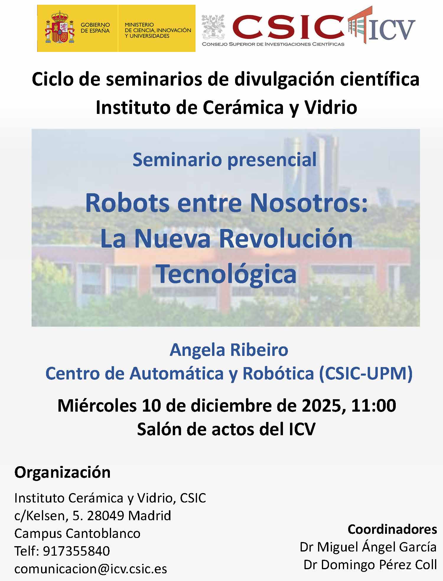Ángela Ribeiro Seijas, coordinadora del Grupo de Investigación en Percepción Artificial en el Centro de Automática y Robótica (CSIC-UPM), imparte este seminario con el título: 'Robots entre nosotros: la nueva revolución tecnológica'.