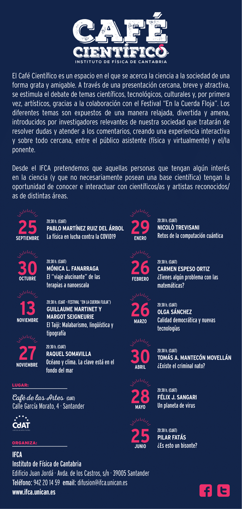 Puedes encontrar las charlas anteriores en el canal de Youtube del Café Científico y seguir la información sobre las sesiones en las publicaciones de Facebook y Twitter.
