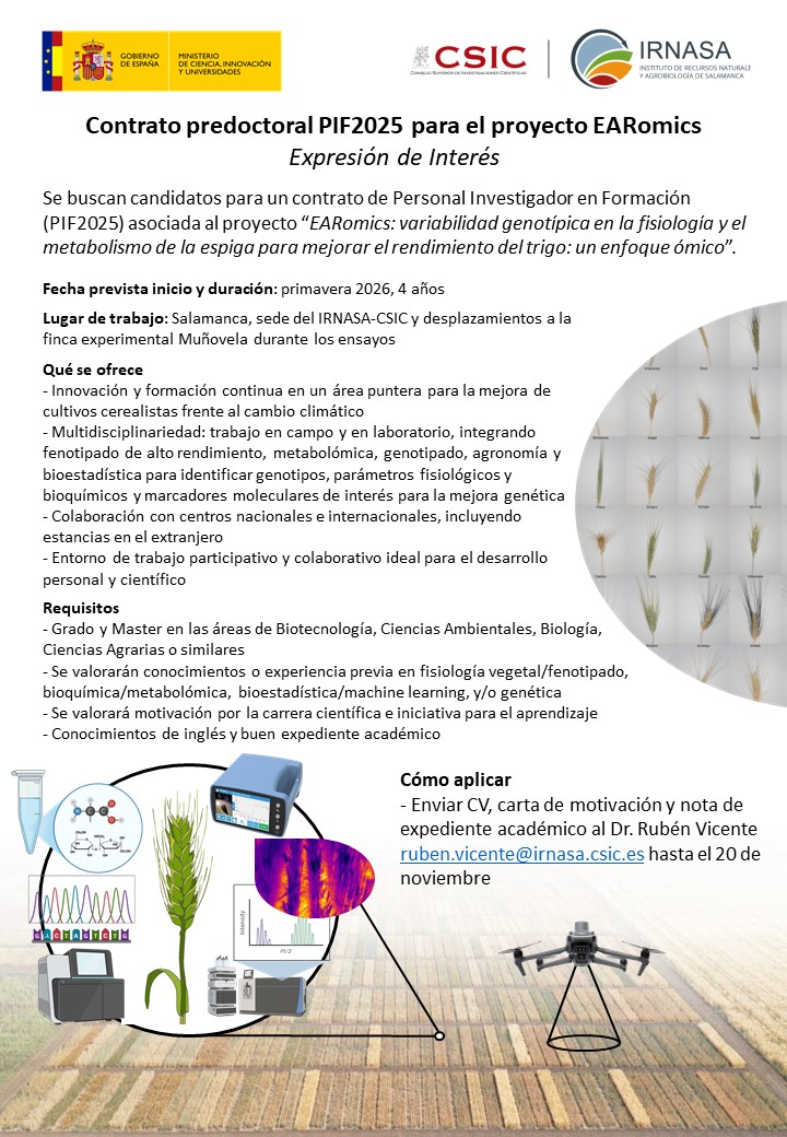 Se buscan candidatos para un contrato de Personal Investigador en Formación (PIF2025) asociada al proyecto EARomics. El objetivo es evaluar la plasticidad fenotípica y metabólica de las espigas de trigo y la asociación de los atributos de la espiga con el rendimiento en una población cultivada en campo como prueba de concepto para identificar y validar nuevas dianas para la mejora en la agricultura mediterránea en un escenario de cambio climático. Para ello, (i) desarrollaremos una plataforma novedosa de fenotipado de campo para cuantificar los atributos de la espiga, (ii) optimizaremos el fenotipado molecular para caracterizar el metabolismo, (iii) identificaremos los atributos clave de la espiga para un alto rendimiento y resiliencia, y (iv) determinaremos los marcadores moleculares asociados con estos atributos. El contrato predoctoral tendrá una duración de 4 años, localizado en el IRNASA-CSIC de Salamanca, pero con visitas a la estación experimental durante las campañas. Se ofrece innovación y formación continua en un área puntera para la mejora de cultivos cerealistas, multidisciplinariedad (fenómica, metabolómica, genómica, bioestadística, etc.), y colaboración con centros punteros. Se buscan candidatos motivados por la carrera científica con buen expediente académico en ramas como Biología, Biotecnología, Bioquímica, Ciencias Agrarias, Ambientales o similares (Grado y Master), valorando positivamente experiencia previa en alguna de las temáticas del proyecto.