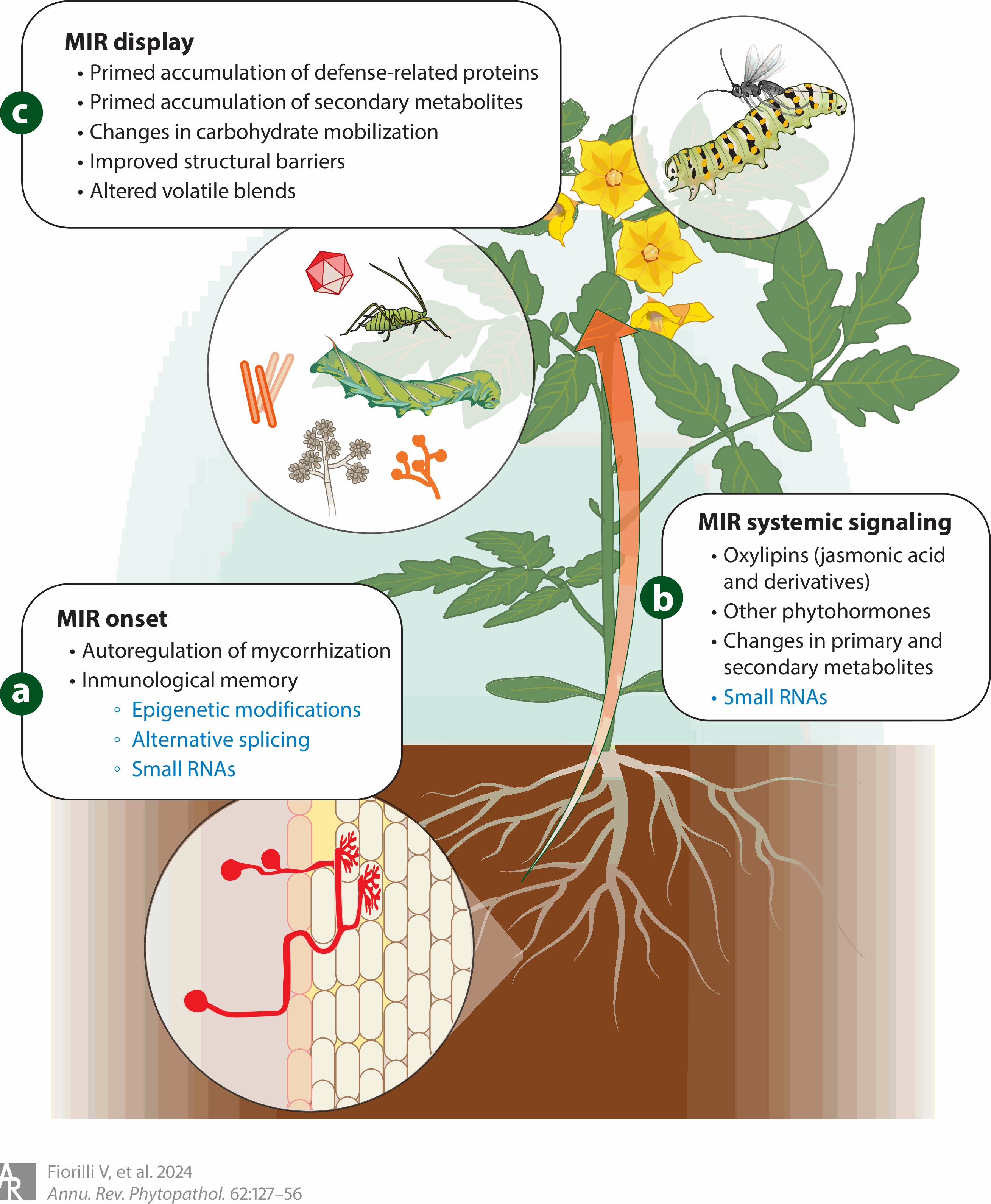 Certain beneficial soil microbes, such as arbuscular mycorrhizal fungi and Trichoderma species, can modulate plant immunity and enhance resistance to insect pests. We previously showed that microbe-induced plant resistance (MIR) is an effective tool for integrated pest management in horticulture. However, key gaps remain, particularly regarding the molecular mechanisms regulating MIR, limiting its full potential. This project aims to fill these gaps by leveraging existing omics data and established plant–microbe–insect bioassays. The goal is to refine our understanding of MIR-mediated defense regulation, focusing on components involved in MIR onset, systemic signaling, and effects on herbivores (second trophic level) and natural enemies (third trophic level). This project integrates multi-omics, bioinformatics, functional genomics, pharmacological tools, and multitrophic bioassays to achieve four objectives: (1) functionally characterize differentially regulated metabolites, proteins, genes, and transcription factors as novel MIR elements; (2) uncover signaling mechanisms coordinating MIR, with emphasis on oxylipins; (3) determine the role of plant volatiles in pest repellence and interactions with natural enemies; and (4) explore long-term and transgenerational MIR effects on herbivores. The project will deepen understanding of MIR’s mechanistic basis and long-term impacts, supporting its optimization as a sustainable alternative to chemical pesticides.